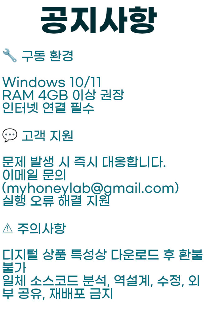 ** 구동 중 모르겠거나, 문의 사항 등이 있으면 myhoneylab@gmail.com 으로 문의해 주세요!